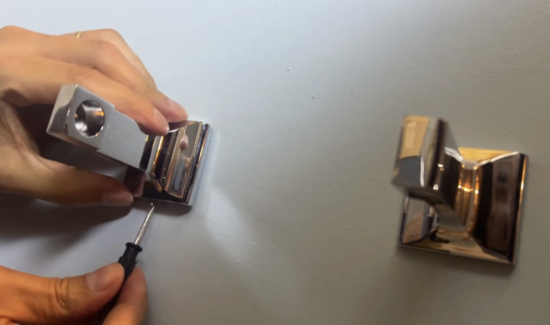 - Look underneath the decorative side pieces (the “escutcheons”) for a small set screw.